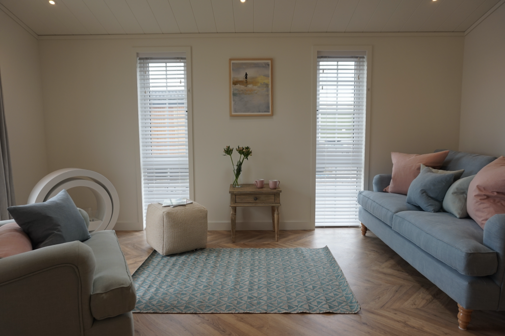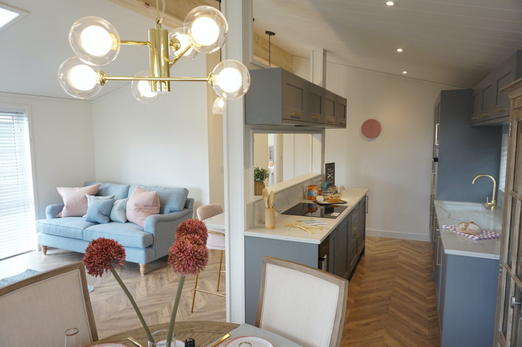 The large open plan living area provides an easy informal style. With a three-seater sofa and armchair featuring an abundance of pastel colours, complementing the overall theme of the room. The focal point of the room is easily the futuristic circular bio-ethanol fire. Not only is this portable, allowing you total flexibility to even take outside but also one of the most eco-friendly options available on the market.
