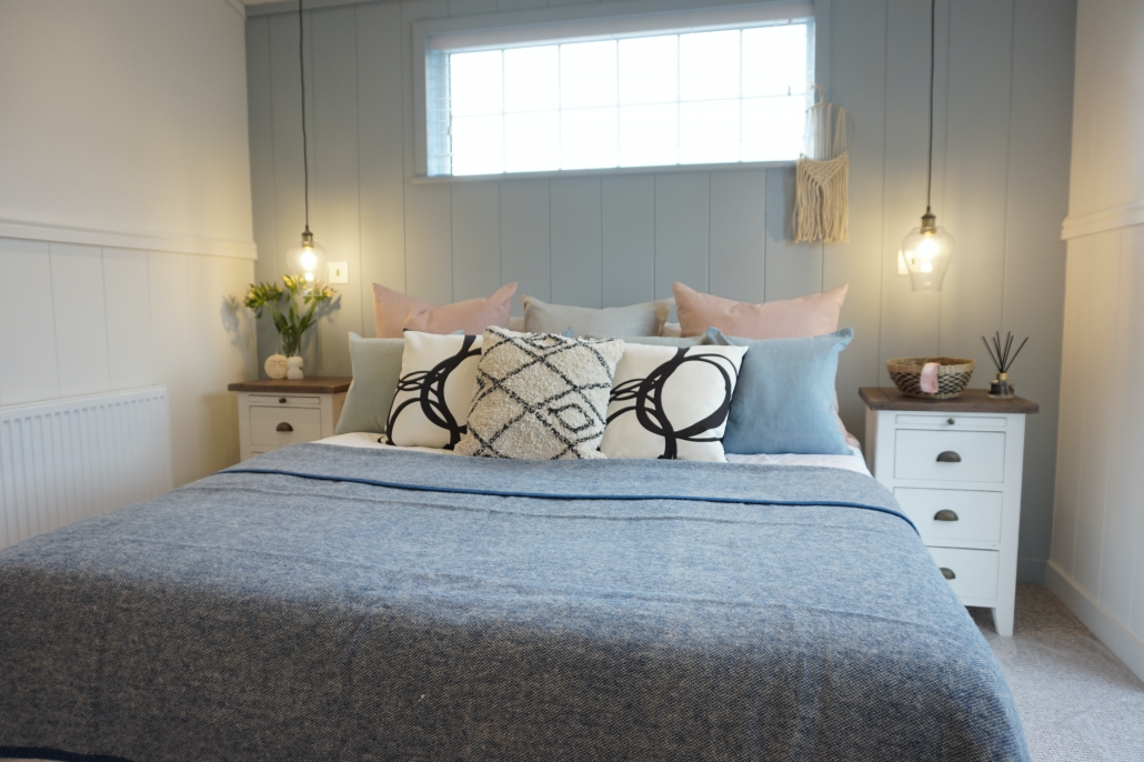 The master bedroom showcases a pastel blue feature wall with hanging feature lights suspended above the chalky white, designer bedsides. Above the bed is a large landscape Georgian glassed window allowing for a burst of natural light to fill the room. Complete with a large inbuilt wardrobe, chest & dressing area which leads through into the en-suite with a large shower.