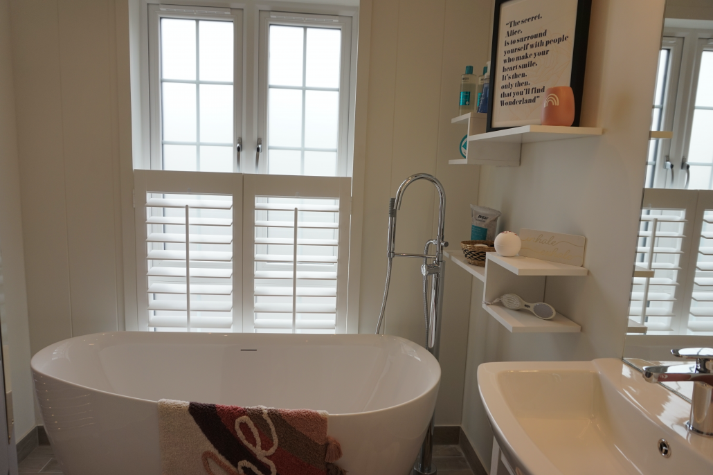 Opposite the second bedroom is the main bathroom. The bathroom is fitted with a towel radiator, a partial internal shutter and a beautifully designed tear-drop shaped bath. With feature shelving, large vanity and fully tiled floor – this room is luxurious & practical; maximising space and finished to the highest quality.